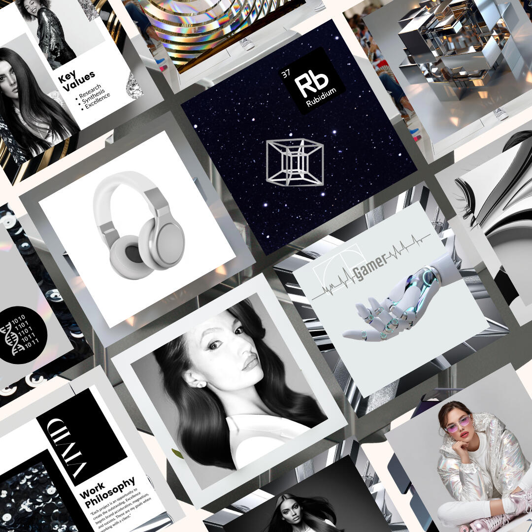 Design Layout (non AI), Font Styling Inside Letters (non AI), Stock Photos & Elements Selections for Eyeshadows, Liquid Chrome & Rock (non AI), AI Prompting for Model Image and Trend-Inspired Pantone Color for Makeup on Model.